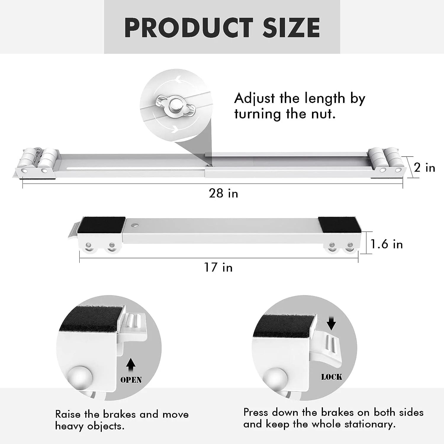 Scalable & Easy to Store This furniture dolly features a telescopic base design, allowing you to adjust it vertically and horizontally to fit furniture of various sizes. Each base can be extended from 17" to 28", making it suitable for heavy objects like washing machines, refrigerators, and cabinets. When not in use, simply store the dolly in any corner of your room for easy removal.